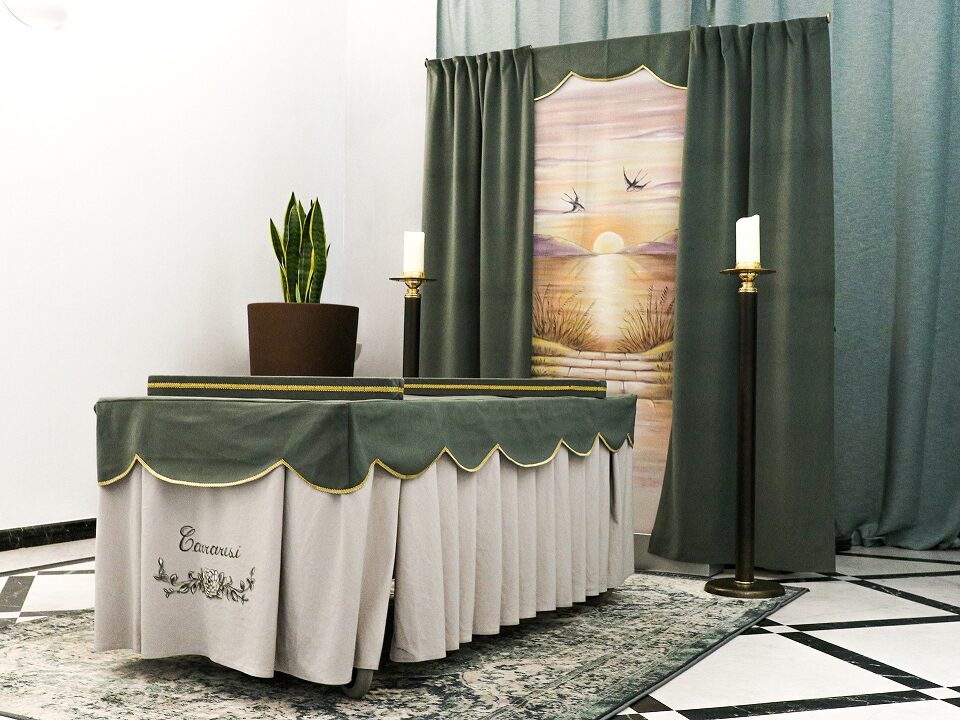 La camera ardente alfa presenta uno stile sobrio ed elegante, caratterizzato da tonalità di verde e crema con dettagli dorati, che nell’insieme conferiscono un senso di solennità e rispetto. L’uso di tessuti drappeggiati e raffinate rifiniture dona un aspetto curato e armonioso.