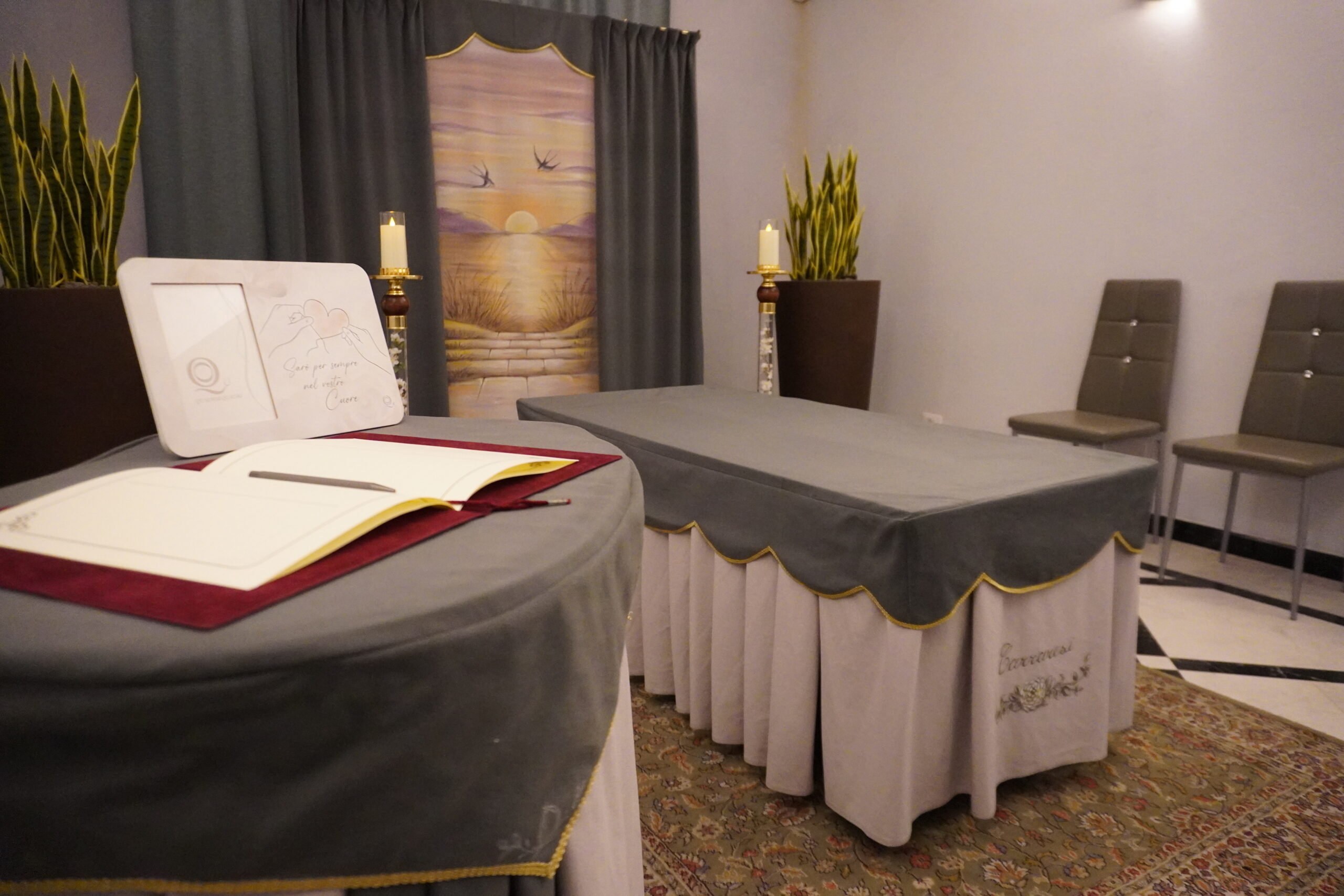 L’atmosfera è raccolta, pensata per favorire il commiato in un ambiente sereno. Il fondale con il dipinto del tramonto e le rondini in volo simboleggia il passaggio e la pace eterna, aggiungendo un tocco poetico e spirituale alla stanza.