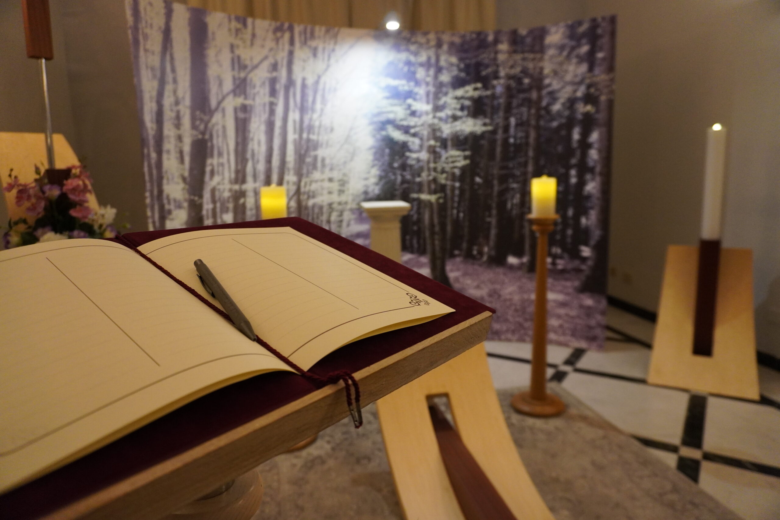 L’illuminazione calda e soffusa, con candelabri di legno e colonne richiamano la classicità, bilanciando l’essenzialità delle linee moderne. La presenza di fiori e piante aggiunge un tocco di vita e speranza, mentre il tappeto chiaro crea un senso di accoglienza e delicatezza.