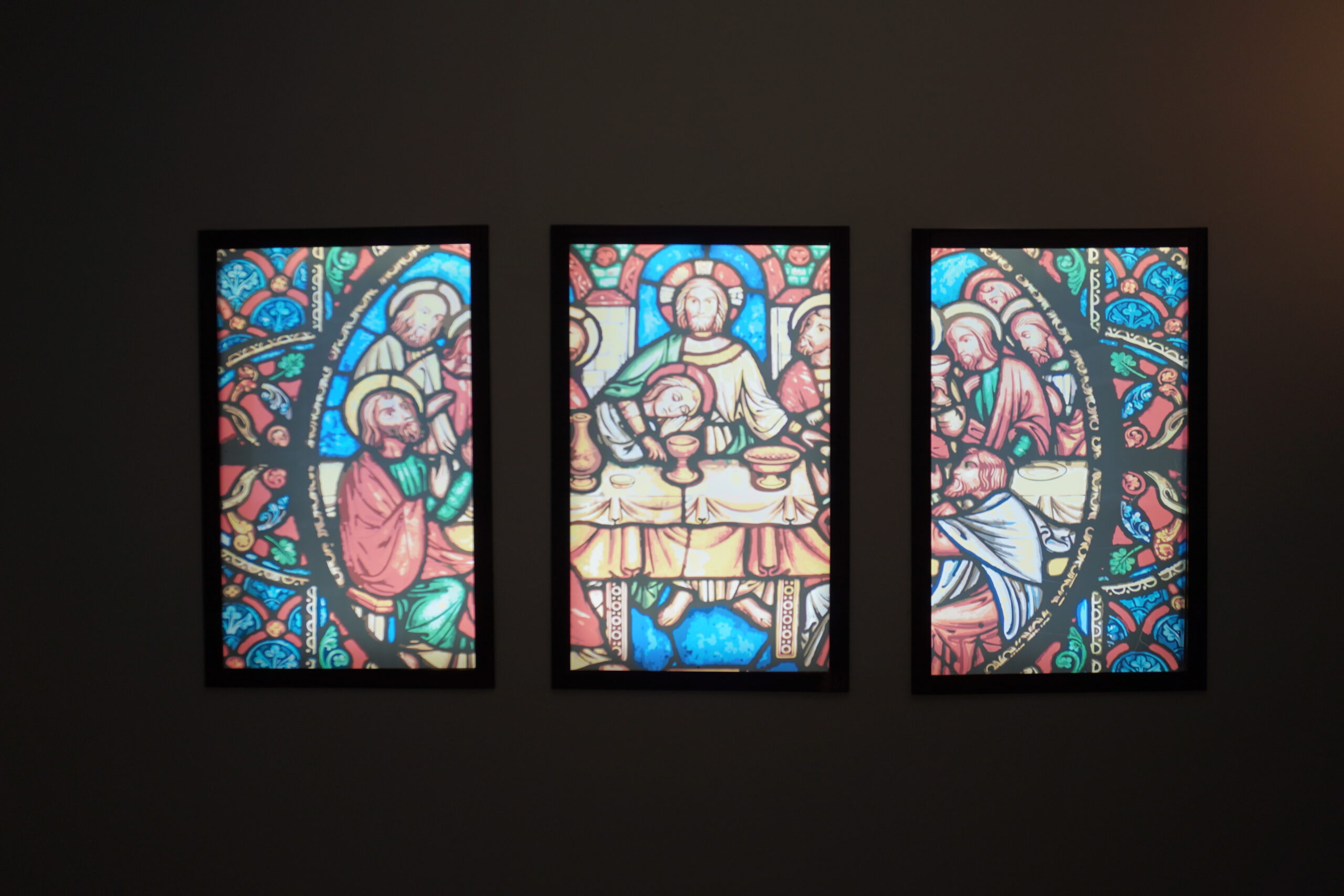 Lo stile combina elementi tradizionali e moderni: le panche in legno con cuscini neri offrono un tocco contemporaneo, mentre gli elementi decorativi mantengono un forte richiamo alla spiritualità cristiana. Le vetrate raffiguranti L’ultima cena aggiungono un dettaglio raffinato e suggestivo, filtrando la luce in modo evocativo.